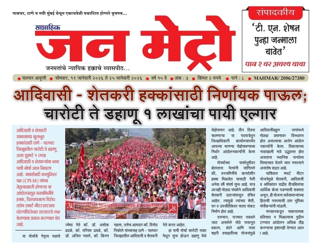 E-PaperJan Metro 19Jan to 25Jan Monali Patil1 month ago1 month ago01 mins E-Paper-19Jan26 Post navigation Previous: पालघरमध्ये १ लाख आदिवासी -शेतकऱ्यांचे वादळ! हक्कासाठी चारोटी ते पालघर पायी एल्गारNext: मागण्या मान्य न झाल्यास थेट मंत्रालयावर कूच करू; मार्क्सवादी कम्युनिस्ट पक्षाचा सरकारला निर्वाणीचा इशारा Leave a Reply Cancel replyYour email address will not be published. Required fields are marked *Comment * Name * Email * Website Save my name, email, and website in this browser for the next time I comment.