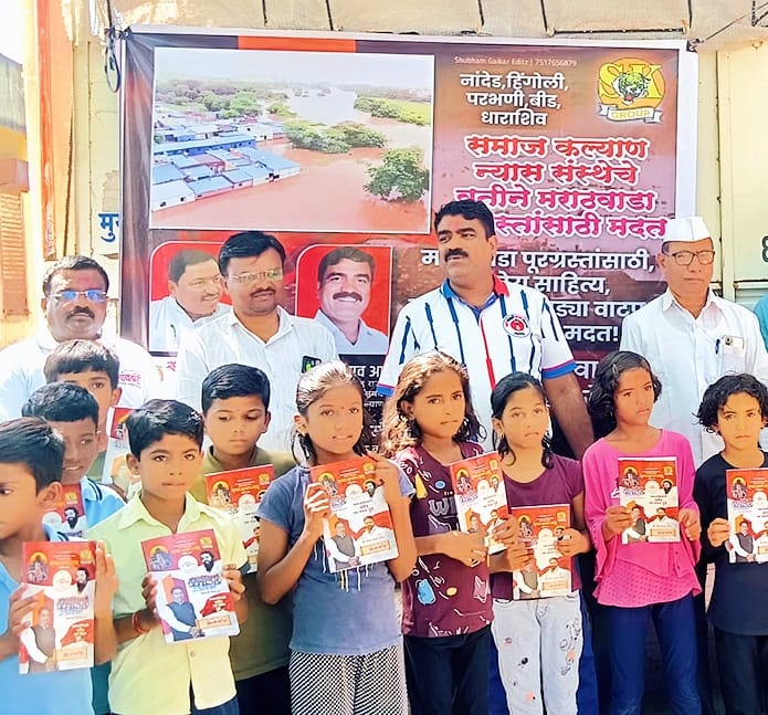 यावर्षी मराठवाड्यात मोठ्या प्रमाणात पाऊस झाल्यामुळे अनेक गावांना पुराच्या पाण्याचा फटका बसला. शेकडो कुटुंब बेघर होऊन रस्त्यावर आली. हजारो शेतकऱ्यांचे मोठ्या प्रमाणात नुकसान झाले. ऐन दिवाळीच्या तोंडावर शिमगा करण्याची दुर्दैवी वेळ आल्यामुळे या पीडितांचे अश्रू पुसण्यासाठी समाज सेवेसाठी सदैव एक पाऊल पुढे टाकणारे एन.के.टी. ग्रुप ठाणे तसेच समाज कल्याण न्यास महाराष्ट्र राज्य, दैनिक समर्थ गांवकरी समूह आणि महाराष्ट्र राज्य पत्रकार संघ मुंबई यांनी पुढाकार घेत मराठवाड्यातील 1001 कुटुंबियांना 1000 रुपयाच्या विविध साहित्यांचे मदतीचे किट वाटपास सुरुवात केली आहे. संस्थापक अध्यक्ष डॉक्टर सोन्या पाटील यांनी मोठ्या विश्वासाने पीडितांचे अश्रू पुसण्यासाठी पत्रकार संघाचे प्रदेश सरचिटणीस डॉ. विश्वासराव आरोटे यांच्या टीमला मराठवाड्यात मदतीचे किट घेऊन पाठवले आहे. त्यामुळे या पीडित कुटुंबीयांचे दुःख दूर करण्यासाठी त्यांच्या जीवनात पुन्हा एकदा आनंदाची उभारी देण्यासाठी ही मदत निश्चितच ऊर्जा निर्माण करणारी ठरणार आहे.