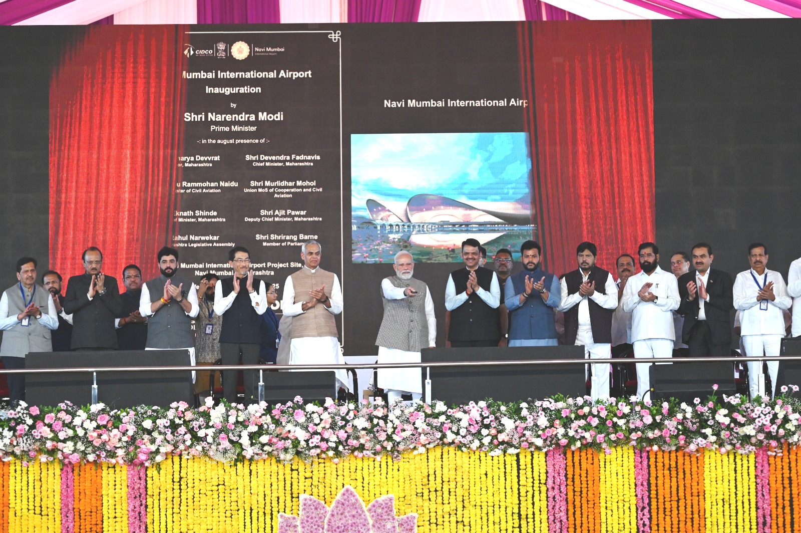 नवी मुंबई आंतरराष्ट्रीय विमानतळ परिसरातील प्रांगणात झालेल्या या कार्यक्रमास राज्यपाल आचार्य देवव्रत, मुख्यमंत्री देवेंद्र फडणवीस, उपमुख्यमंत्री एकनाथ शिंदे, उपमुख्यमंत्री अजित पवार, केंद्रीय नागरी उड्डाण मंत्री किंजरापू राममोहन नायडू, केंद्रीय राज्यमंत्री मुरलीधर मोहोळ, केंद्रीय सामाजिक न्याय राज्यमंत्री रामदास आठवले, विधानसभा अध्यक्ष ॲड. राहुल नार्वेकर, जपानचे भारतातील राजदूत ओनू केईची, वन मंत्री गणेश नाईक, सांस्कृतिक कार्य मंत्री ॲड. आशिष शेलार, कौशल्य, रोजगार, उद्योजकता व नाविन्यता मंत्री मंगलप्रभात लोढा, महिला व बालविकास मंत्री अदिती तटकरे, परिवहन मंत्री प्रताप सरनाईक, लोकसभा सदस्य श्रीरंग बारणे, खासदार सुनील तटकरे, खासदार नरेश म्हस्के, खासदार धैर्यशील पाटील, आमदार सर्वश्री रवींद्र चव्हाण, अमित साटम, प्रशांत ठाकूर, महेश बालदी, विक्रांत पाटील, मंदाताई म्हात्रे, अदानी ग्रुपचे चेअरमन गौतम अदानी यांच्यासह लोकप्रतिनिधी व विविध मान्यवर उपस्थित होते.