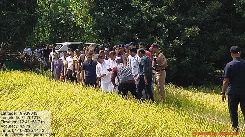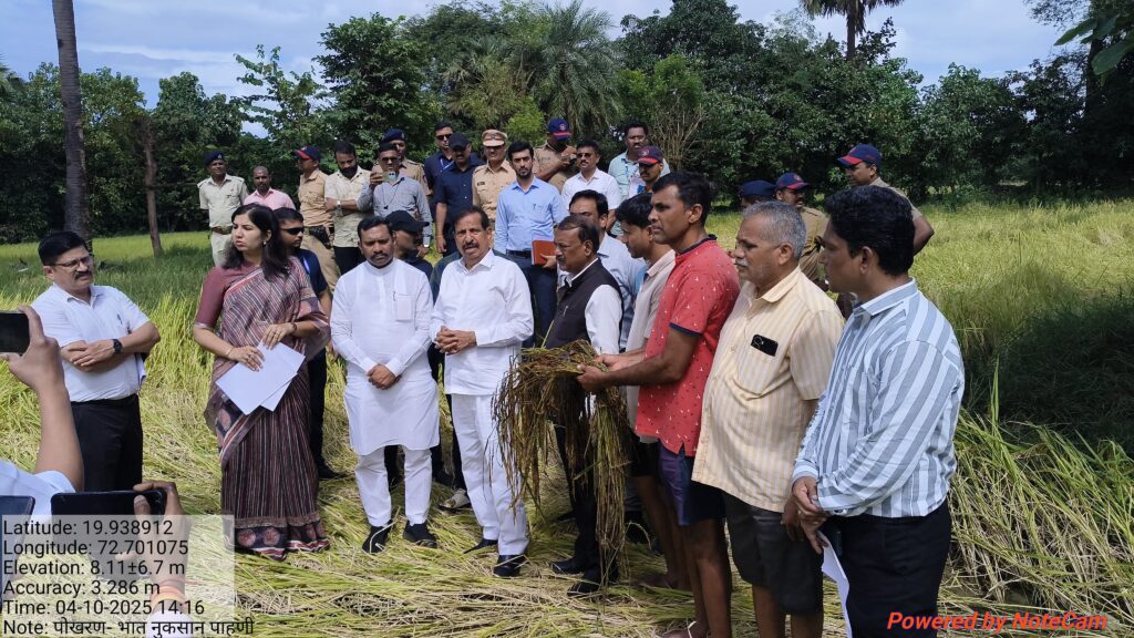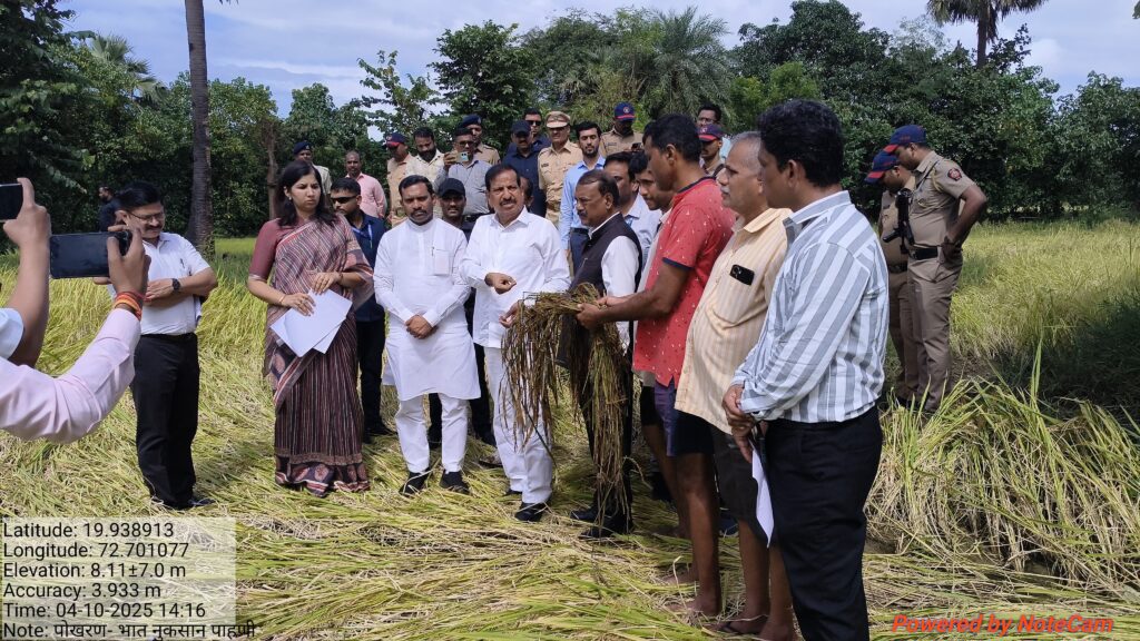 पालकमंत्री गणेश नाईक यांनी डहाणू तालुक्यातील पोखरण येथील शेतकरी दत्तात्रय पाटील यांच्या शेतावर जाऊन प्रत्यक्ष नुकसानीचा आढावा घेतला. भात पिकाचे पंचनामे तातडीने पूर्ण करून अहवाल शासनाकडे सादर करण्याच्या सूचना त्यांनी अधिकारी यांना दिल्या.