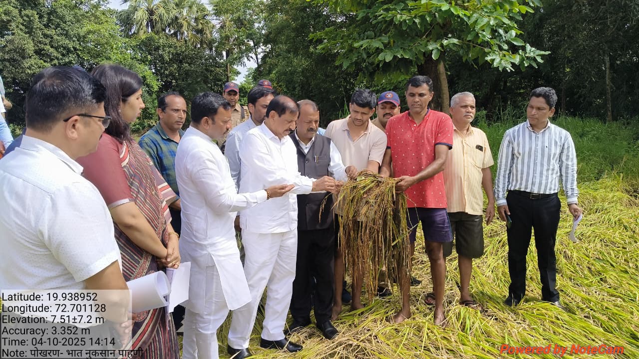 पालकमंत्री गणेश नाईक यांनी डहाणू तालुक्यातील पोखरण येथील शेतकरी दत्तात्रय पाटील यांच्या शेतावर जाऊन प्रत्यक्ष नुकसानीचा आढावा घेतला. भात पिकाचे पंचनामे तातडीने पूर्ण करून अहवाल शासनाकडे सादर करण्याच्या सूचना त्यांनी अधिकारी यांना दिल्या.