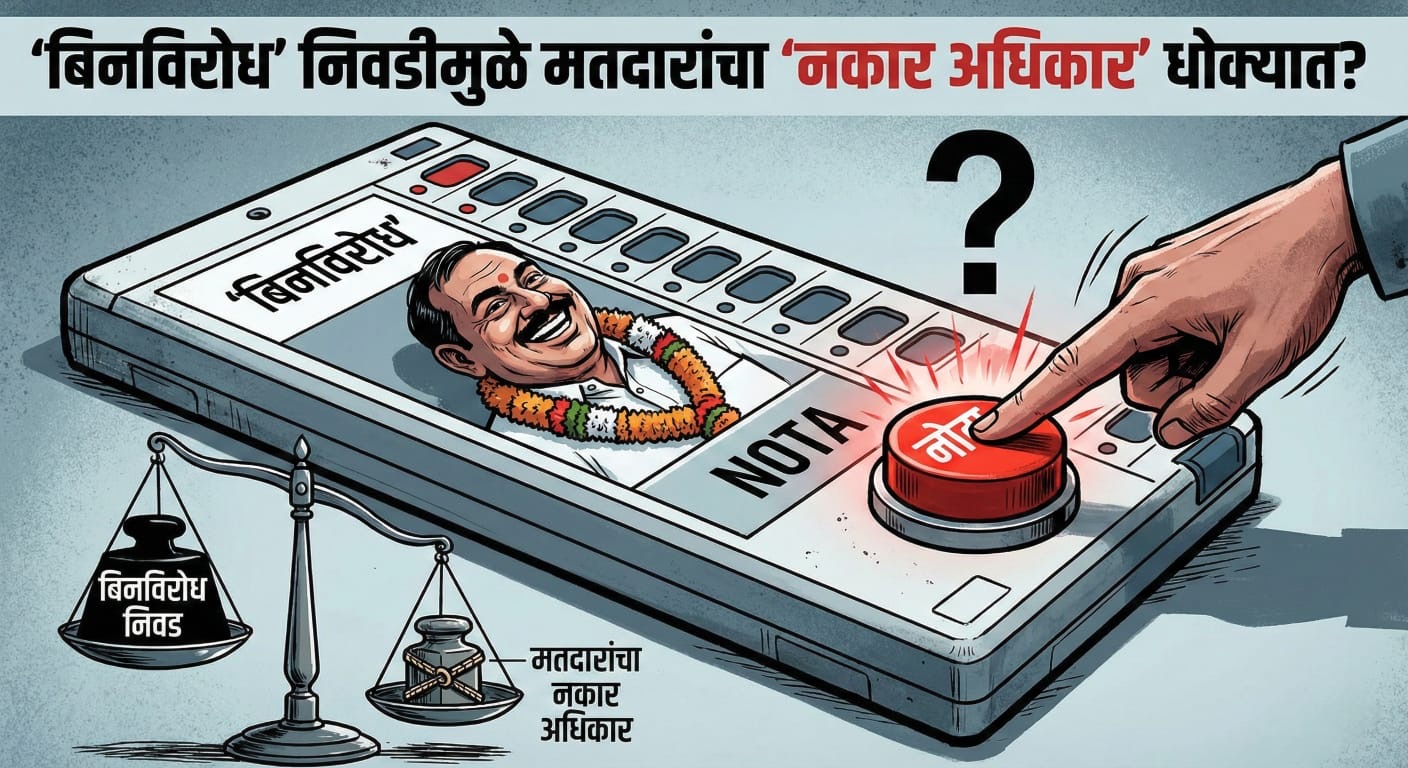 लोकशाहीत उमेदवाराला निवडून देण्याइतकाच अधिकार त्याला नाकारण्याचाही आहे. मात्र, अनेकदा ‘बिनविरोध’ निवडणुकीच्या नावाखाली मतदारांचा हा घटनात्मक हक्क हिरावून घेतला जात असल्याचा दावा करत, ‘ग्रीन रुद्राक्ष चॅरिटेबल ट्रस्ट’ने निवडणूक आयोगाकडे धाव घेतली आहे. एकच उमेदवार रिंगणात असला तरी ‘नोटा’ (NOTA) हा सक्षम पर्याय असल्याने ईव्हीएमद्वारे मतदान घेणे बंधनकारक करावे, अशी मागणी संस्थेने केली आहे.